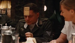 He is seen in the La Louisiane tavern, from the French village of Nadine, playing the card name game with Wilhelm and his friends. The man is drinking beer and celebrating the birth of Wilhelm's newborn son along with his comrades. When Hicox, Stiglitz and Wicki enter the tavern disguised as SS officers to meet up with Bridget von Hammersmark, the Wehrmacht soldier, along with his buddies stand up and salute the trio, thinking they were real German army officers. Before Bridget leaves the group to join the Basterds, the man and the other soldiers wave goodbye, not before reminding her she still has her name card on her forehead.